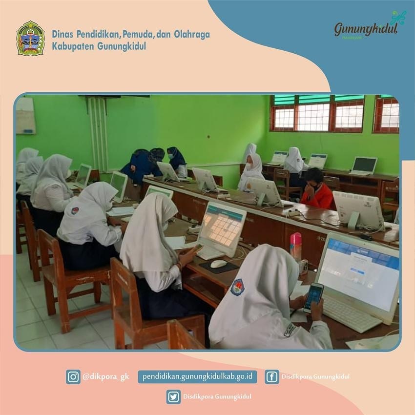 WONOSARI- Dinas Pendidikan,Pemuda, dan Olahraga (Disdikpora) Kabupaten Gunungkidul melalui Bidang Sekolah Menegah Pertama (SMP) melaksanakan kegiatan Gladi Bersih Assesmen Nasional jenjang SMP se- Kabupaten Gunungkidul. Kegatan diikuti 4.910 peserta didk Kelas VIII SMP selama dua hari mulai tanggal 13 September 2021 samapai dengan 14 September 2021 secara langsung dengan menerapkan protokol kesehatan pencegahan virus COVID-19.